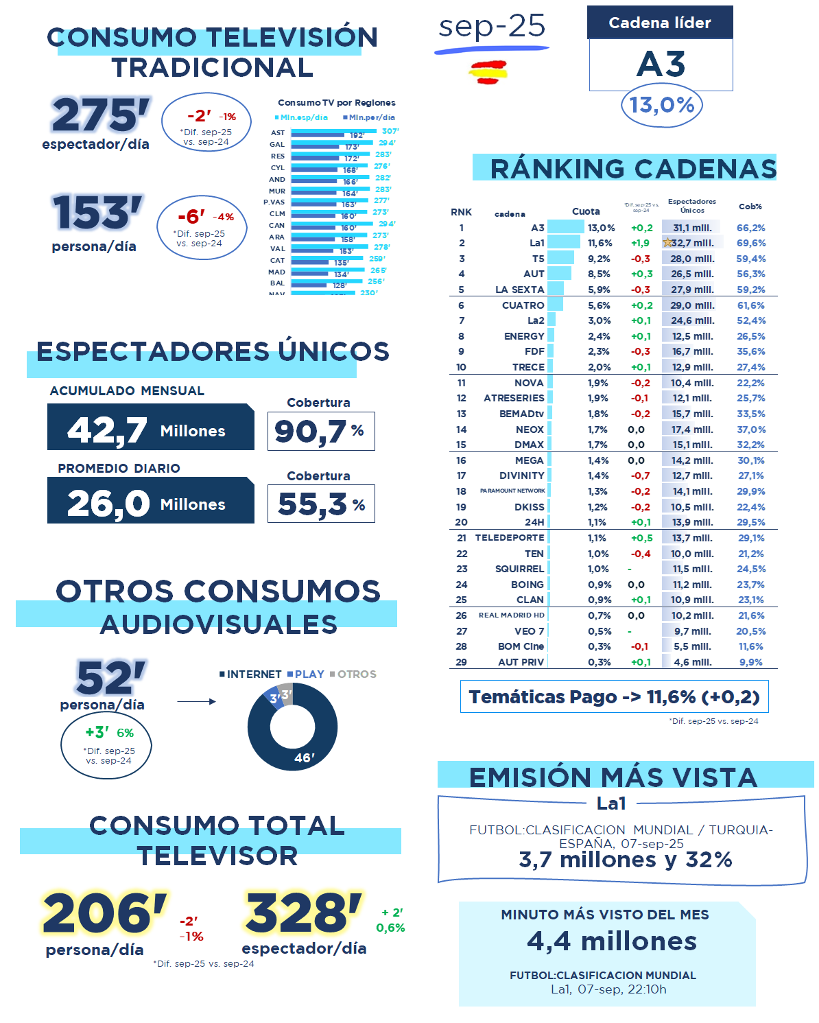 º EMISIÓN MÁS VISTA DEL MES: La emisión más vista del mes corresponde a FUTBOL:CLASIFICACION MUNDIAL / TURQUIA-ESPAÑA (La1, 07-sep-25) con 3,7 millones y 32% de cuota de pantalla.