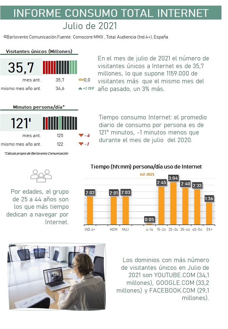 En el mes de julio de 2021 el número de visitantes únicos a Internet es de 35,7 millones, lo que supone 1.159.000 de visitantes más que el mismo mes del año pasado, un 3% más.