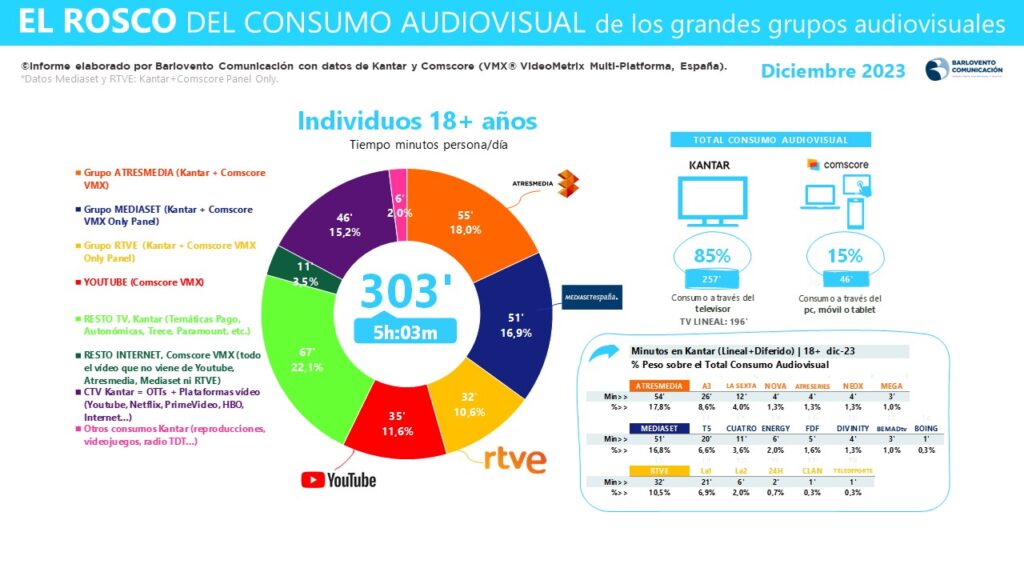En el mes de diciembre 2023 los individuos de 18+ años de edad consumieron un promedio diario de 303 minutos de contenidos audiovisuales.