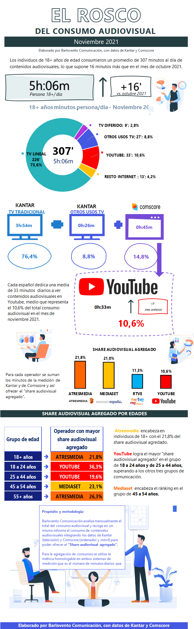 El grupo de 18 a 24 años consumió un promedio de 182 minutos al dÃa de contenidos audiovisuales en noviembre 2021. El 50,3% del tiempo de visionado es a través del ordenador o móvil y YouTube lidera con el 36,3% del share audiovisual agregado.